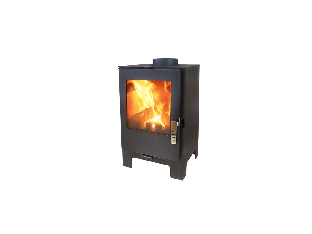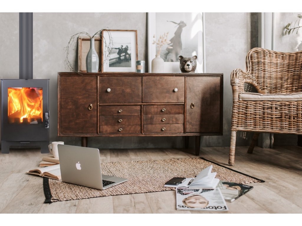 Krbová kamna v moderním designu se snížením výkonem, vhodná pro nízkoenergetické domy.