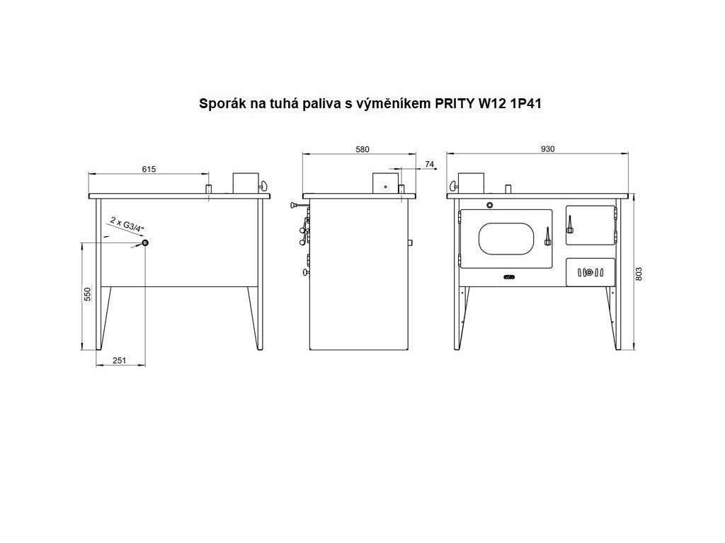 Sporák na tuhá paliva s teplovodním výměníkem PRITY W12 1P41, levá